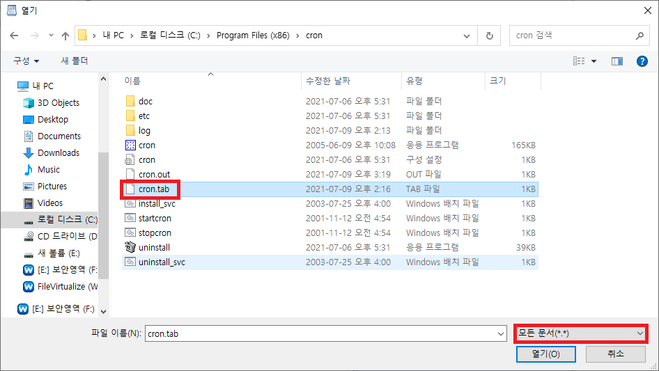 - 모든 문서(*.*)로 해야 cron.tab이 보인다.